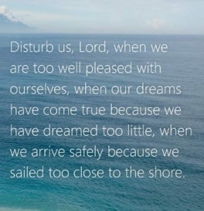 Disturb us, Lord, when We are too pleased with ourselves, When our dreams have come true Because we dreamed too little, When we arrived safely Because we sailed too close to the shore. Disturb us, Lord, when With the abundance of things we possess We have lost our thirst For the waters of life; Having … Read more