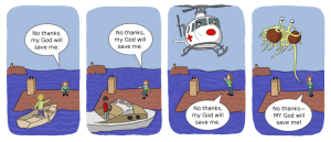 There was an old man sitting on his porch watching the rain fall. Pretty soon the water was coming over the porch and into the house. The old man was still sitting there when a rescue boat came and the people on board said, “You can’t stay here you have to come with us.” The … Read more